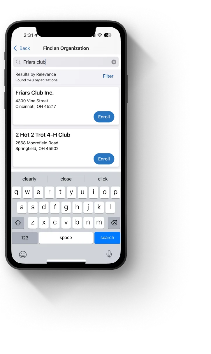 You will see a card for Friars Club Inc. 4300 Vine Street Cincinnati, OH 45217, select the Enroll button to finalize the process.